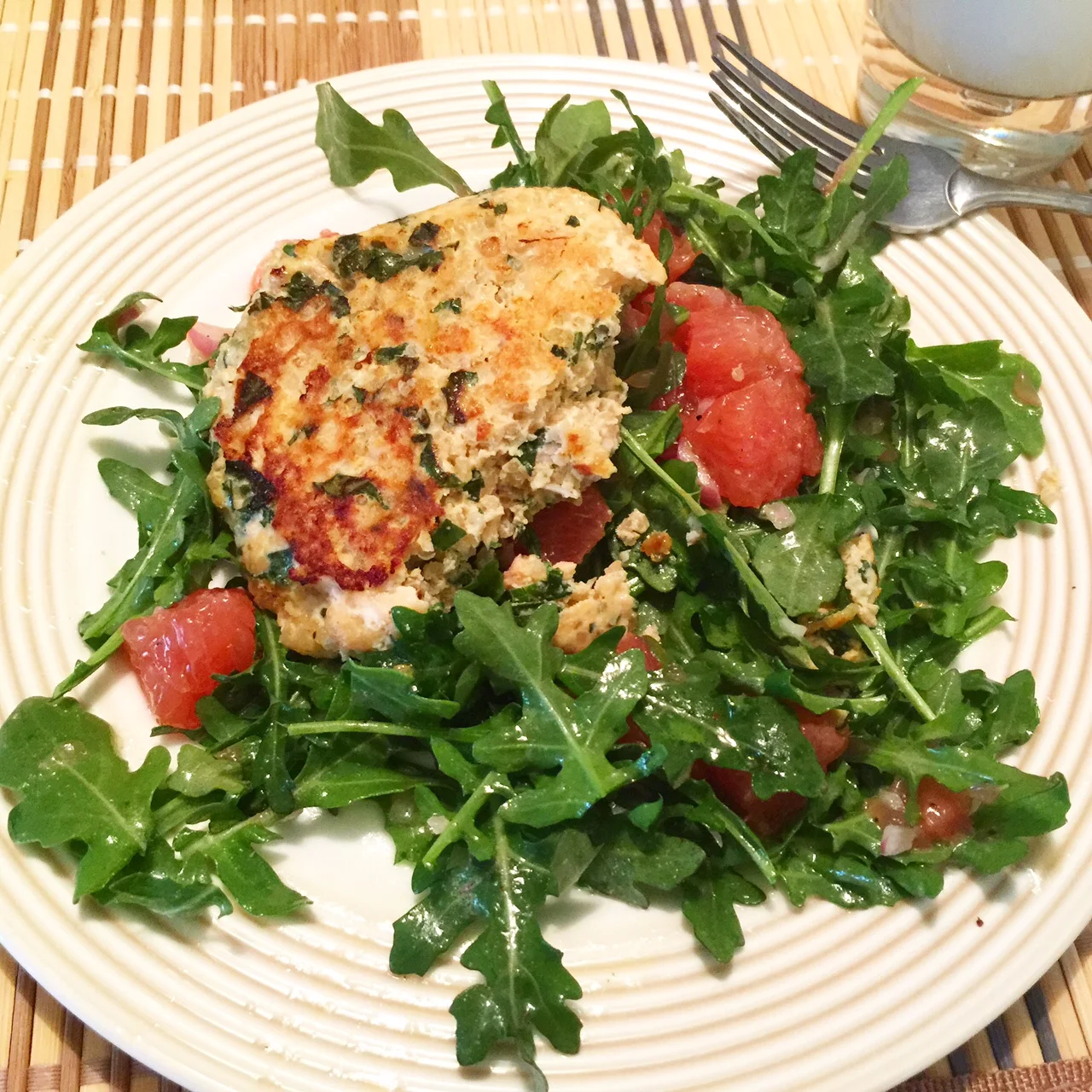 Toss the dressing with the arugula and grapefruit; divide on four plates. Top each salad with a salmon burger.