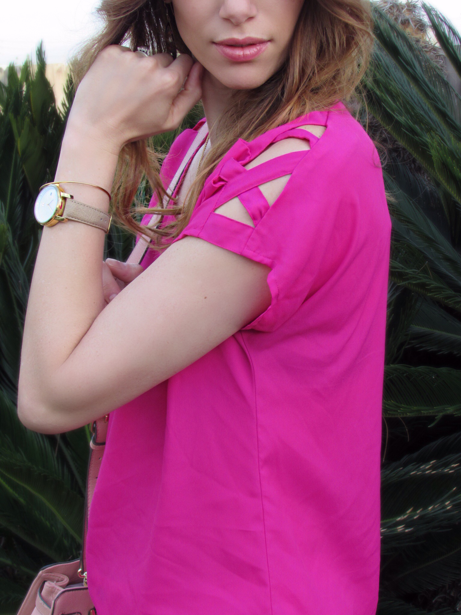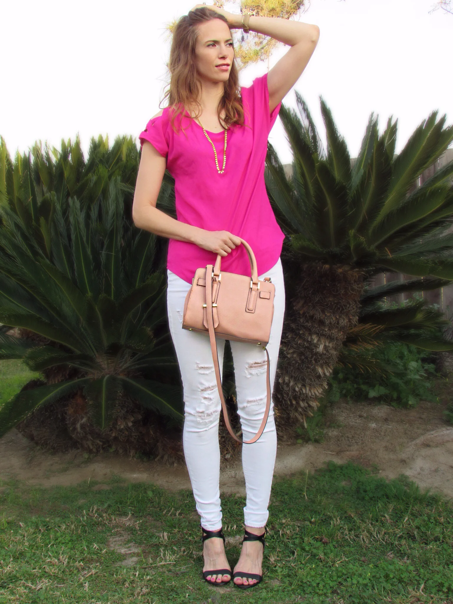 Even though we didn't have plans on the 14th, and I was just at my parent's house hanging out and playing with my son, I wanted to feel a little festive, so this is the look I threw on. The top I've had for several years (from Express) and I love it for its bright color and being wearable like a t-shirt but being cuter than a basic. Paired it with some new distressed white skinny jeans (brave, I know, when you're chasing a toddler around) and a contrasting shade of pink bag and I was a walking Valentine for the day. :)