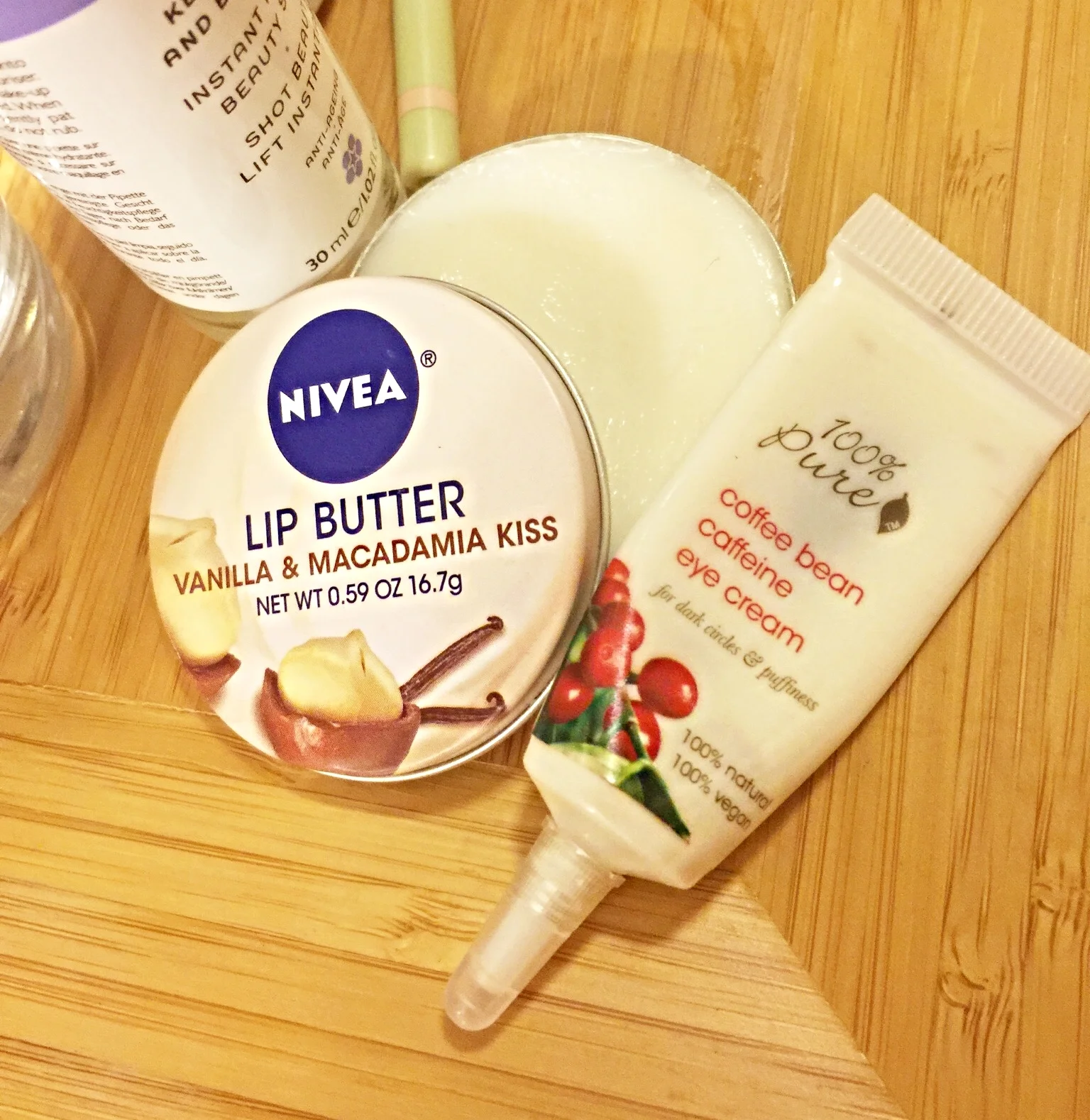 Like I said, a night with some cocktails takes its toll on me more noticeably nowadays. Externally that is reflected in my face in the morning, with puffy eyes, dry lips and blah skin, all of which make me look old and tired. These are my battle tools: