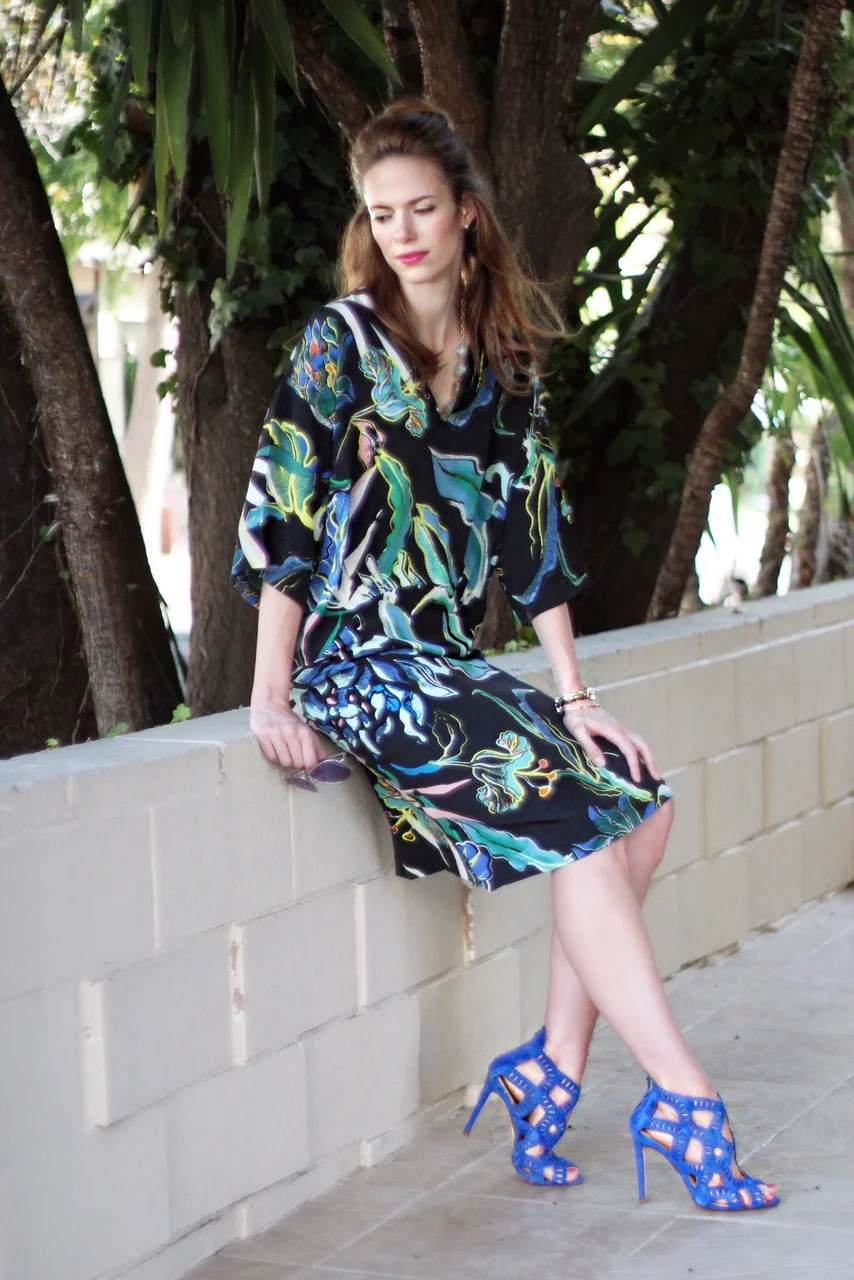 The dress is silk, and loose and flowy, and the print is gorgeous.  It's currently significantly on sale.