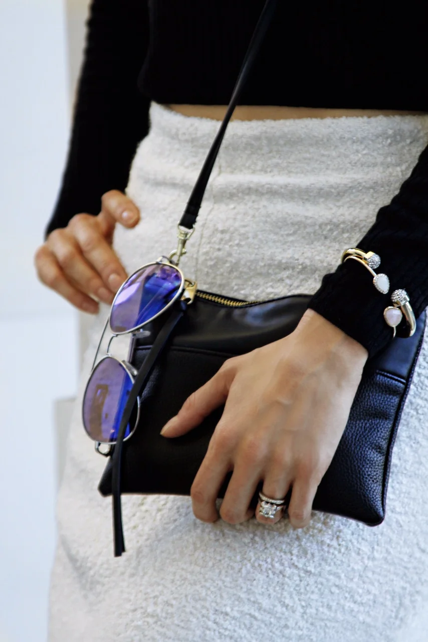 For the beach I just wore my swimsuit and denim cut-offs.  But after cleaning up, I was loving this new top I got (under $20!)  It is minimalist and modern, with cut outs that reveal a little skin without revealing too much. You can wear a normal bra with it, and it is so easy to dress up or down.  Here, I dressed it up with some wide leg slacks and leopard print heels, keeping accessories to a minimum, to keep with the mono-chromatic minimalist vibe.