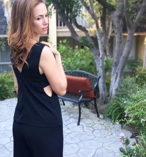For the beach I just wore my swimsuit and denim cut-offs.  But after cleaning up, I was loving this new top I got (under $20!)  It is minimalist and modern, with cut outs that reveal a little skin without revealing too much. You can wear a normal bra with it, and it is so easy to dress up or down.  Here, I dressed it up with some wide leg slacks and leopard print heels, keeping accessories to a minimum, to keep with the mono-chromatic minimalist vibe.